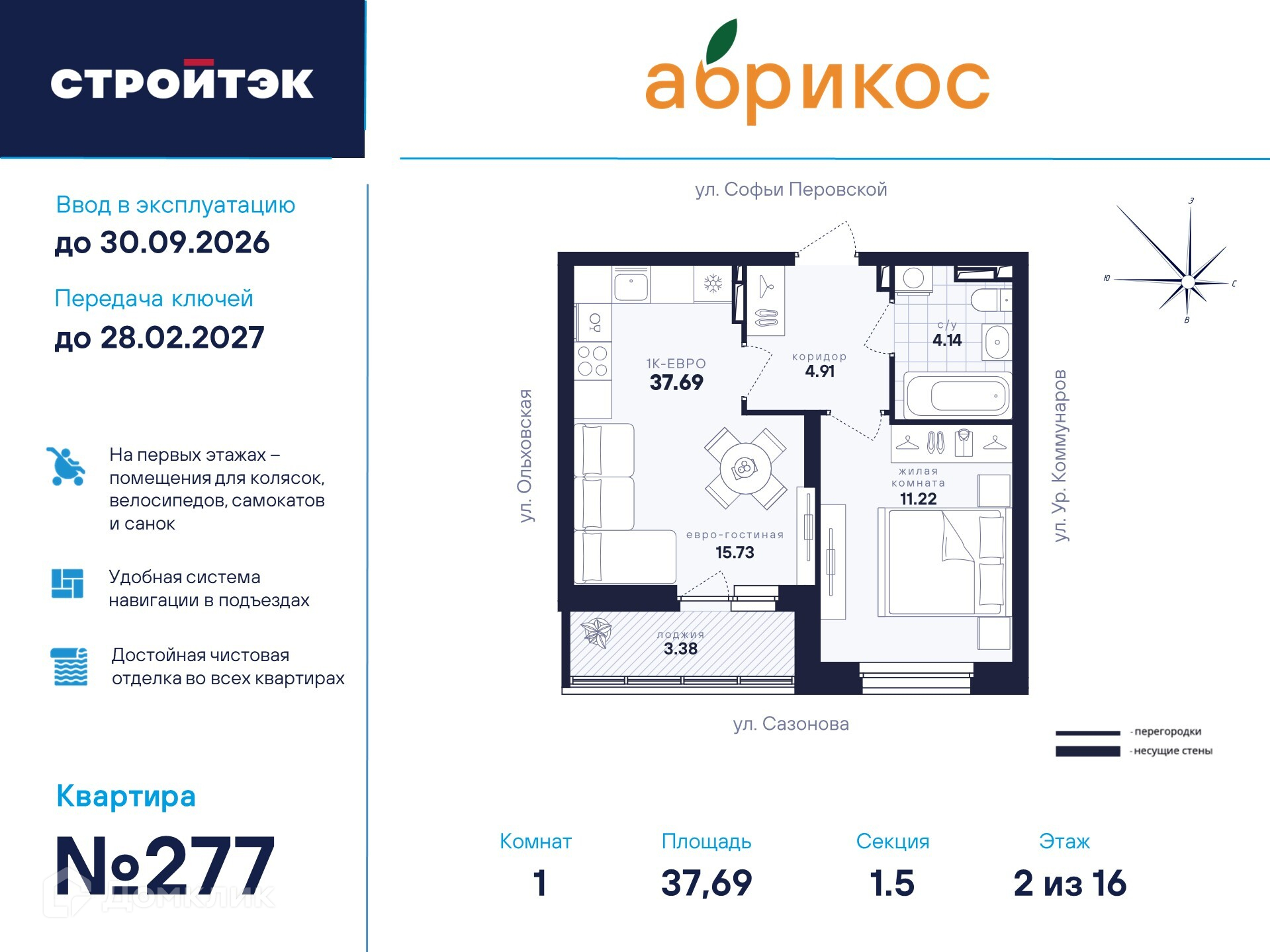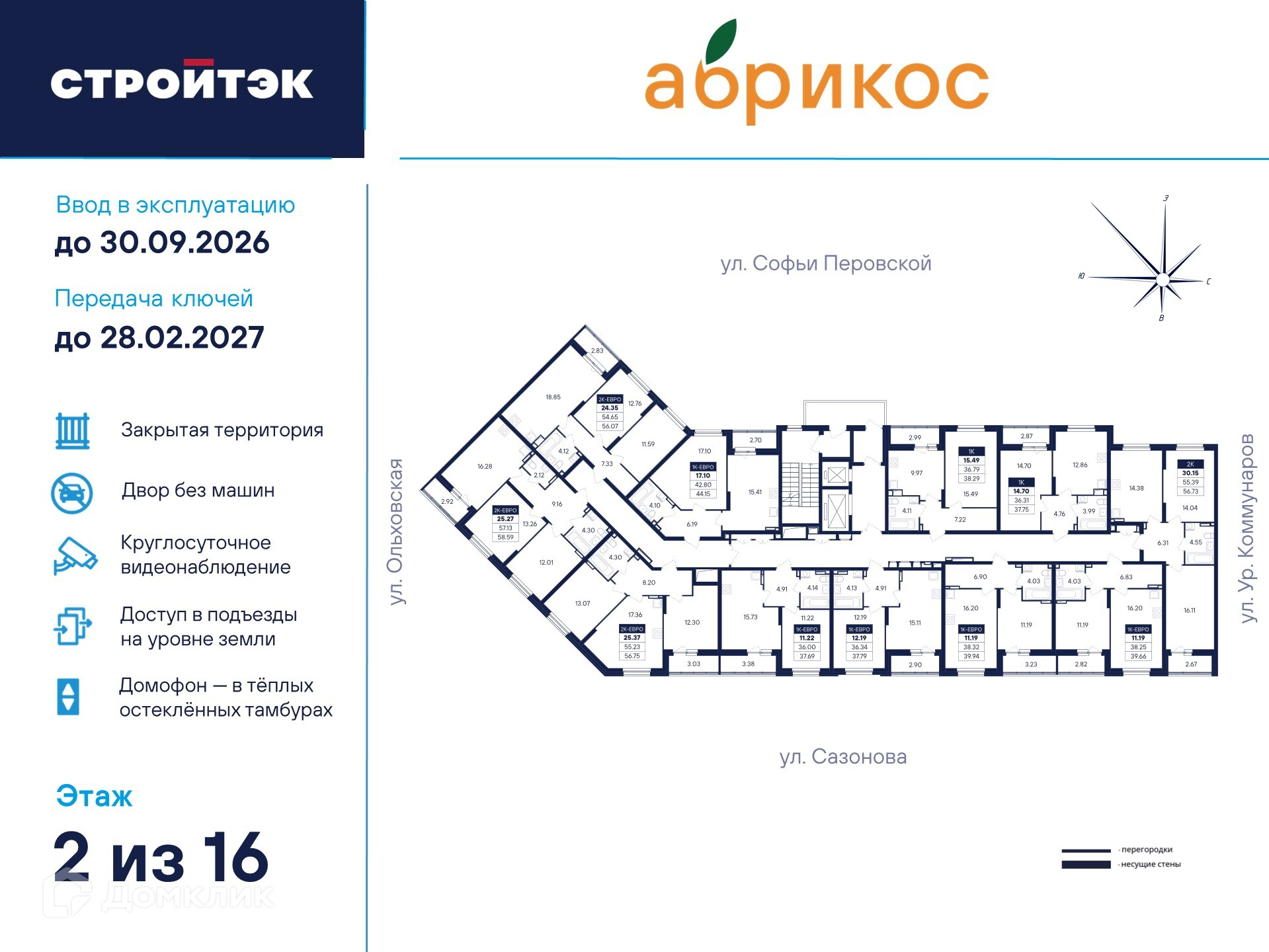 ### Свежий «Абрикос» В новом доме ЖК «Абрикос», расположенном на северо-западе Екатеринбурга, представлены комфортные условия для проживания. Мы хотим видеть всё больше счастливых лиц наших клиентов, поэтому продолжаем развивать яркие проекты во всех районах города. В новый этап строительства входят секции 1.1-1.4 переменной этажности 9-17 этажей дома №1 в окружении улиц Ольховской, Софьи Перовской и Уральских Коммунаров. Познакомьтесь с «Абрикосом» поближе. Мы создали его таким, чтобы вы были довольны всем, а ваша жизнь в нём была как сам этот фрукт: свежей, сочной, яркой и солнечной. **Район** - Тихий микрорайон Новая сортировка на Северо-западе Екатеринбурга. - 7 школ и 11 детсадов поблизости- 15 минут на машине до кольцевой дороги, а до центра — полчаса даже по пробкам - 20 минут пешком до парка «Таганская слобода» 6 продуктовых магазинов рядом - 10 минут на машине до ТЦ «Карнавал» **Двор** - Во дворе хорошо должно быть всем: детям — площадки по возрасту, взрослым — прогулочные дорожки. Но это не всё. - Концепция «Двор без машин», когда можно заехать только для разгрузки и погрузки - Стритбольная площадка - Вместительная парковка вокруг ЖК - Закрытая территория с пропускной системой и сигнализацией - Круглосуточное видеонаблюдение и освещение территории. **Подъезды** - Не подъезд, а парадная. Так говорят в Петербурге, но и в «Абрикосе» это слово приходит в голову. Просторные холлы с витражами и достойной отделкой. - Доступ в подъезды на уровне земли — без барьеров - Домофоны — в тёплых остеклённых тамбурах- В каждом подъезде — грузопассажирский лифт- Помещения для колясок и самокатов на 1 этаже- Удобная навигация с номерами этажей и квартир **Планировки** - Наш подход к проектированию называется «Разумные метры». Это значит не только исходить из площади, но и учитывать число жильцов и их потребности. - Объединённые кухни-гостиные для простора и общения 3D-модели с вариантами обстановки- Отказ от бесполезных «мёртвых» зон. **Отделка** - В ЖК «Абрикос» мы позаботились о чистовой отделке, чтобы ваш переезд прошёл быстро и не вызвал лишних хлопот. - На полу в комнатах, прихожих и кухнях — прочный водостойкий ламинат, в санузлах — керамическая плитка, потолки — натяжные- Межкомнатные двери и усиленная сейф-дверь на входе в квартиру - В санузлах установлены раковины и унитазы, а во всей квартире — розетки и выключатели- Радиаторы с терморегуляторами и горизонтальной разводкой, двухкамерные стеклопакеты с приточными клапанами вентиляции- Телеметрические счётчики на свет, тепло и воду.