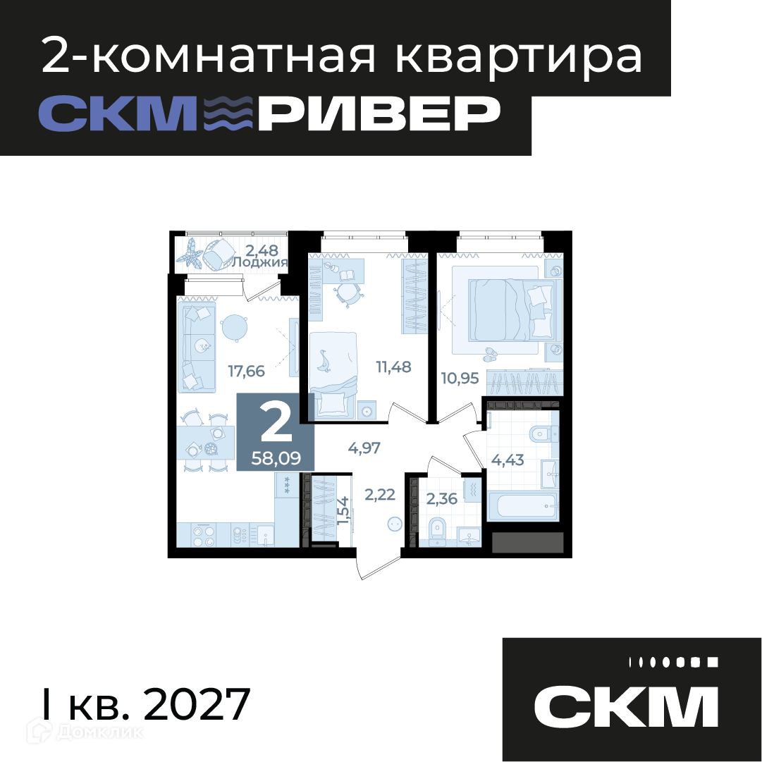 - Общая площадь: 58.09 м²