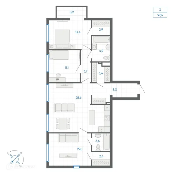 3 комн. квартира в Екатеринбурге в ипотеку от 97 315 руб/месяц