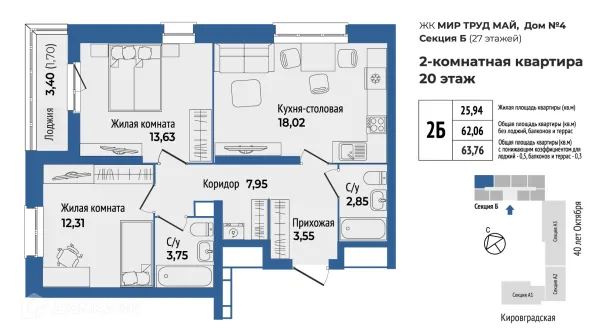 2 комн. квартира в Екатеринбурге в ипотеку от 63 819 руб/месяц